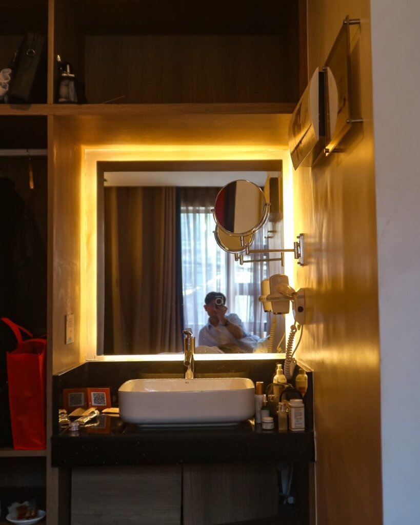 My room had a great city view that really came alive at night. The bed was soft and comfortable, and the space felt clean, warm, and homey. I also appreciated the personal touches like the welcome snacks and letter. One little detail that stayed with me was the handwritten message on the mirror: “It’s the connection we can’t explain.” I even snapped a mirror selfie because it captured exactly how the stay felt—simple, genuine, and memorable.